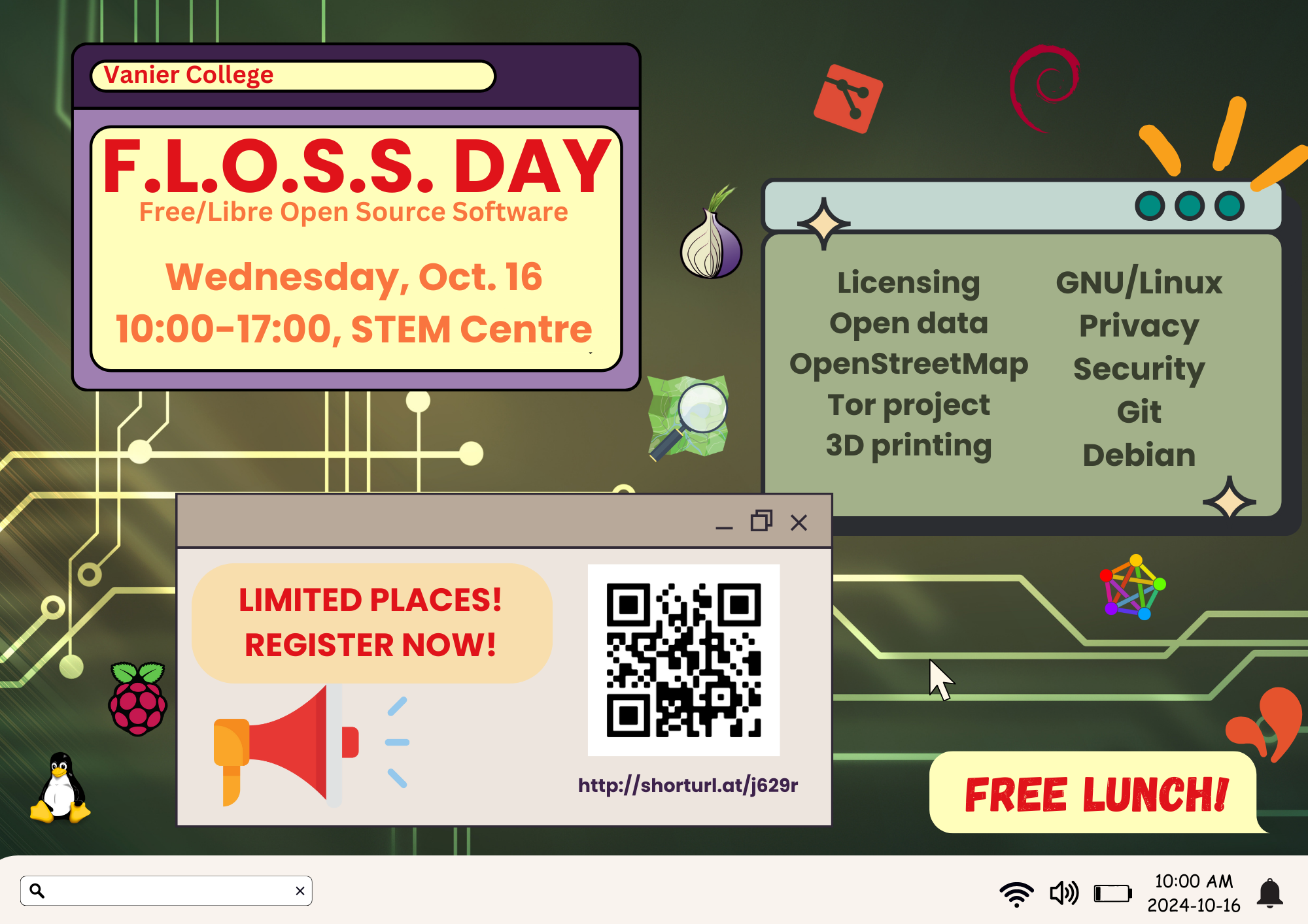 The third edition of Vanier FLOSS Day happened on October 16th 2024, on a Wednesday, during the school Fall break. All Vanier community was invited, through MIOs and a printed poster. This time we did not publicize the event outside the College, since we quickly reached our room capacity.