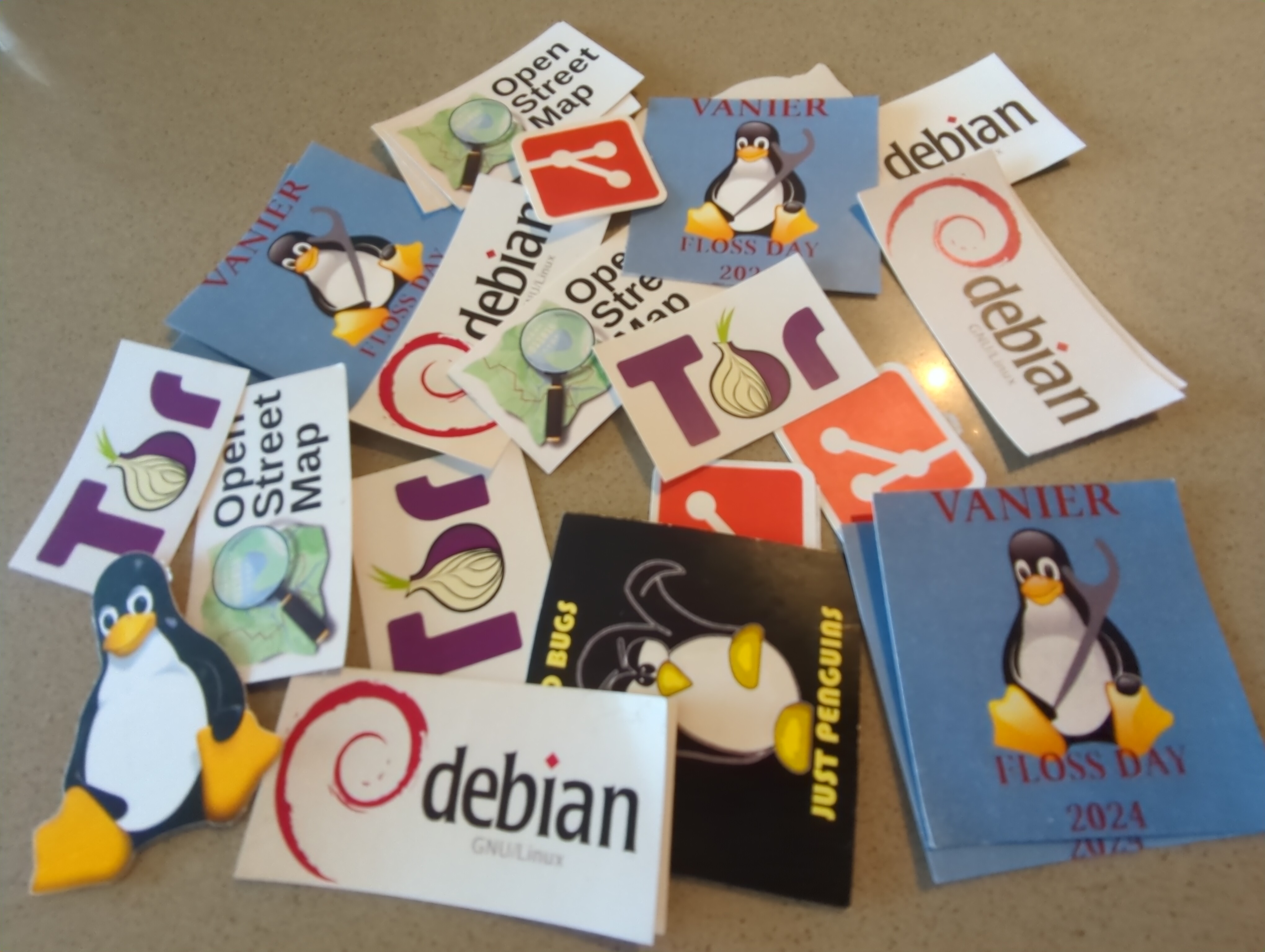 We have also produced some stickers to give away. A couple of original designs for the FLOSS Day, and a few other official logos from FLOSS projects.